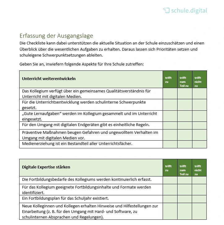 Die folgende Checkliste kann dabei unterstützen, die aktuelle Situation an der Schule in den Handlungsfeldern einzuschätzen und einen Überblick über die wichtigsten Aufgaben zu erhalten.