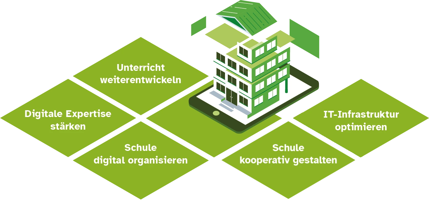 Um die Ausgangssituation an der eigenen Schule zu verstehen und realisierbare Ziele für die Nutzung digitaler Endgeräte im Schulalltag zu definieren, ist es wichtig, die individuelle Situation der Schule in den fünf Handlungsfeldern der digitalen Schulentwicklung zu erfassen.
