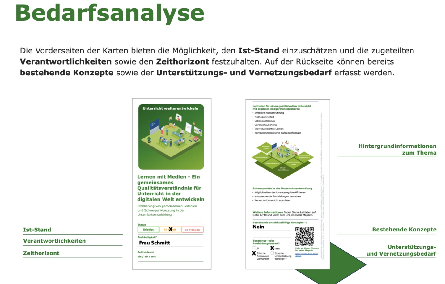 Die Ergebnisse der Bestandsaufnahme dienen als Grundlage für die digitale Weiterentwicklung der Schule, wobei gemeinsam mit dem Kollegium und weiteren beteiligten Personen konkrete Entwicklungsziele und Schwerpunkte formuliert werden.