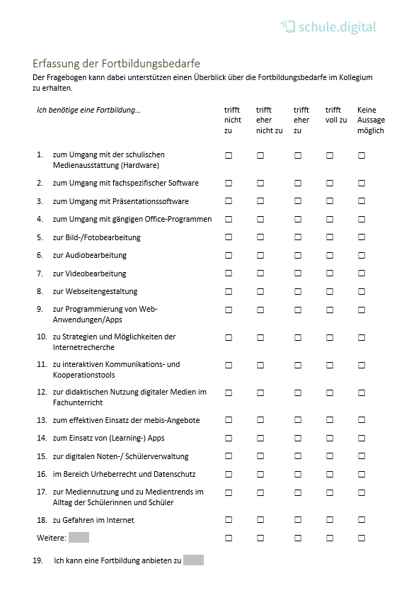 Eine Fortbildungsplanung unterstützt die Lehrkräfte bei ihrem Kompetenzerwerb. Hierzu müssen zunächst die Bedarfe des Kollegiums erfasst werden, um anschließend geeignete Inhalte sowie Formate anbieten zu können.