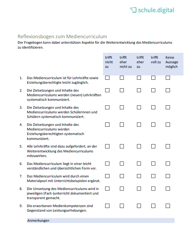 Um einen eventuellen Überarbeitungsbedarf des Mediencurriculums zu ermitteln, ist es sinnvoll, zunächst eine Bestandsaufnahme durchzuführen. Der folgende Reflexionsbogen kann dabei hilfreich sein.