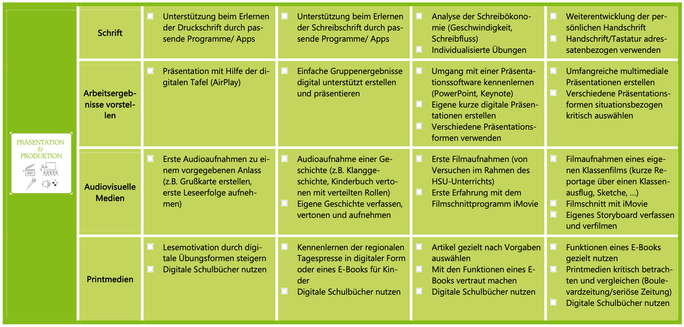 In der Praxis hat sich gezeigt, dass es sinnvoll ist, das Mediencurriculum kompakt zu verfassen, damit die Lehrkräfte jederzeit den Überblick über die zu behandelnden Inhalte behalten. Dies erleichtert auch die regelmäßige Evaluation und Anpassung des Curriculums durch die Jahrgangsstufenteams.