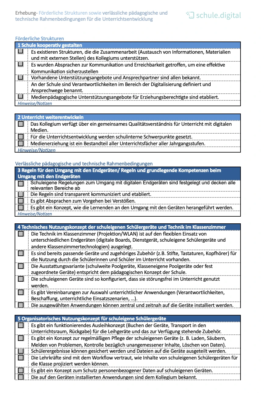 Verlässliche schulinterne pädagogische und technische Rahmenbedingungen bilden das Fundament souveräner Klassenführung. Die Analyse des Ist-Standes ermöglicht es, Stärken sichtbar zu machen und Handlungsfelder für die weitere Entwicklung zu definieren. Dabei sollten die folgenden Bereiche berücksichtigt werden: