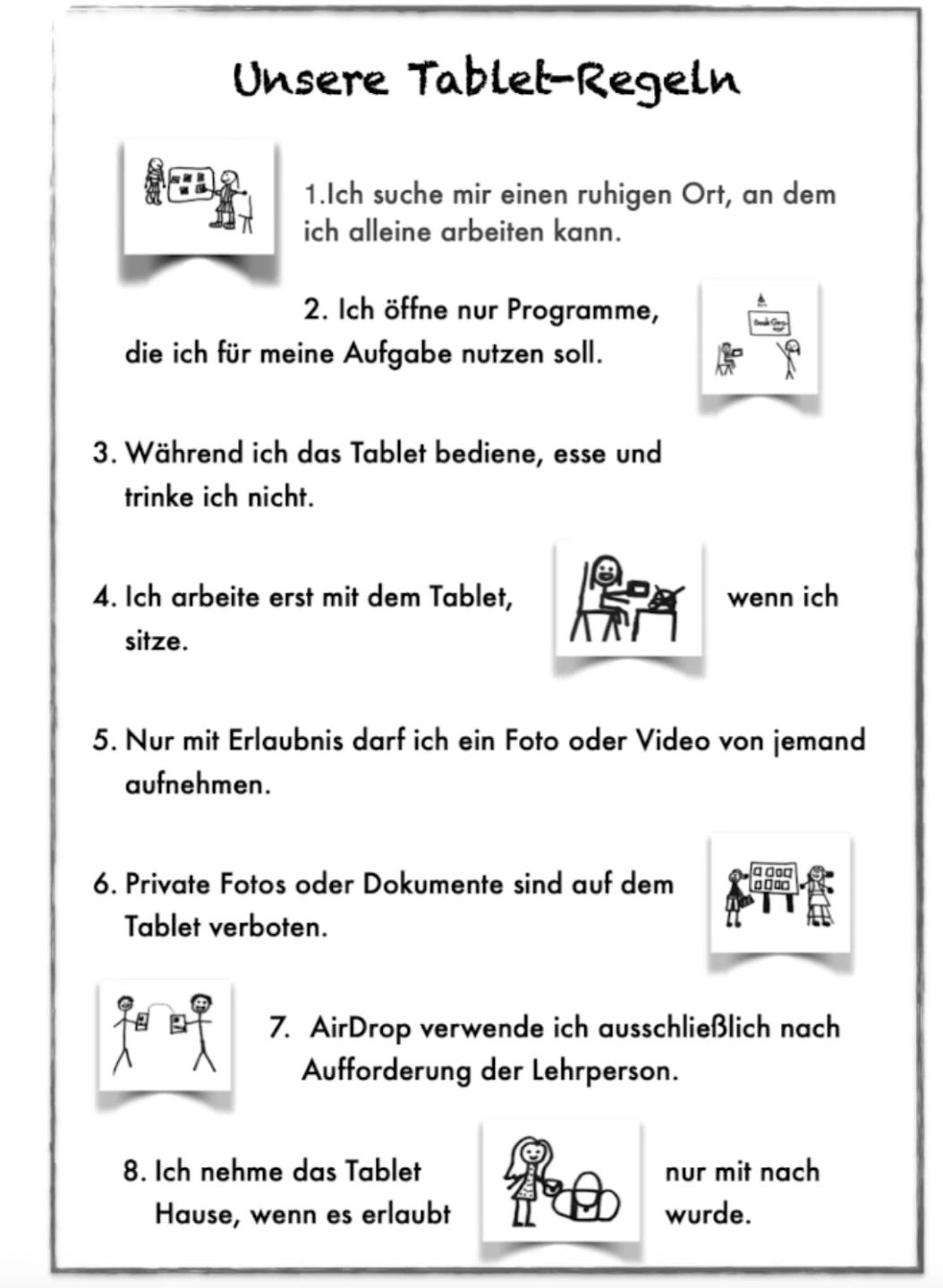 “An unserer Schule gibt es Tablet-Regeln, die vom Kollegium gemeinsam erarbeitet wurden und somit für die ganze Schule gelten. Für die Schülerinnen und Schüler ist es wichtig, dass die gleichen Regeln gelten, egal welche Lehrkraft gerade zuständig ist. Die Tablet-Regeln hängen zum einen als Plakat im Klassenzimmer, zum anderen haben die Kinder sie auch in ihrem Hausaufgabenheft.”